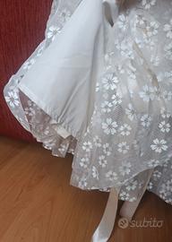 Bellissimo vestitino in tulle ricamato color crema e fiorellini con il centro dorato. Aggiunto un nastro di raso per poter fare fiocco dietro. Secondo me veste un po' grande quindi va benissimo fino a 100 cm. Ottime condizioni. Usato solo una volta per un matrimonio. Consegna a Torino zona Vanchiglia. Possibile spedizione.