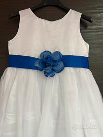 Caratterizzato da una fascia in raso blu reale in vita, decorata con un fiore applicato.