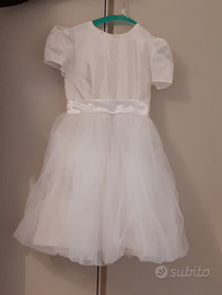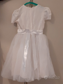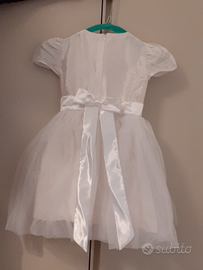 Abito da damigella sartoriale, bianco, corpetto raso opaco, fascia in vita raso lucido, gonna tulle. Fiocco raso lucido che si attacca con clip sulla schiena. Usato 1 volta per l'evento. Da stirare. Disponibile in tg 10 e 4 anni (uguali). Zona Talenti.