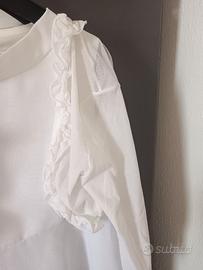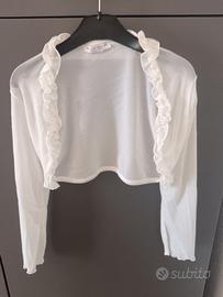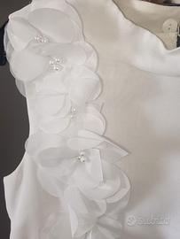 Vendo abito bambina, taglia 10/12 anni, in taffettà bianco, smanicato, con applicazioni fiori e perline. Completo di coprispalle a maniche lunghe e rouches. Usato solo 1 volta. Prezzo 30€ non trattabili.