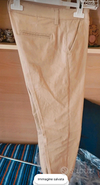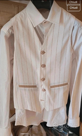 Abito usato 1 sola volta 11 maggio per comunione, composto da pantalone beige, cintura in pelle beige, camicia bianca con bottoni beige che richiamano lo stesso colore dei bottoni del gilet e della giacca, gilet giacca a doppio petto e papillon, il pantalone sotto c è stoffa se lo volete più lungo l ho accorciato senza fare la piega ma cucito solo al lato a mano un punto per bloccarlo. Acquistato dal negozio driblino di Bari. Pagato 260 euro. Chi interessato mi può contattare per avere ulteriori foto e informazioni.taglia 13 anni marca mia kids