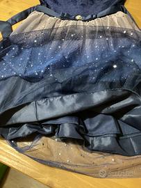 Elegante abito in blu sfumato. Tessuto vellutato sul corpetto, gonna in tullr multi strato sfumato argento cin dettagli scintillanti stelle, fiocco in vita con decorazione