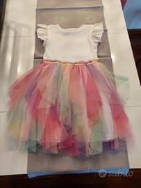 Abito estivo Primark. Gonna con tulle arcobaleno e decoro di strass a forma di gelati sul petto. Taglia 5/6 anni 116cm. Usato solo una volta. Condizioni perfette. Non presenta danni ne difetti.