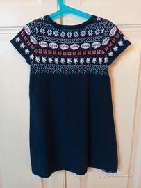 Il vestito è di un elegante blu scuro con un motivo a maglia in stile Fair Isle sul corpetto. La fantasia è ricca di dettagli festivi: