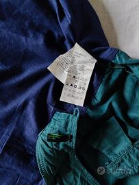 Scamiciato marca Benetton, tg. 11-12 anni (h. 160 cm), cotone, molto leggero, corpino verde scuro e gonna blu con disegni (sottogonna blu), scollo quadrato, apertura cerniera sul fianco, 2 bottoni chiusura collo. Nuovo, mai usato. Misure come da foto.