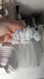 Il corpetto è finemente lavorato in pizzo bianco con maniche a tre quarti rifinite e uno scenografico scollo a balze. Al centro spicca una preziosa spilla gioiello con punto luce che dona un tocco nobilitare. La gonna è composta da un delicato tulle a rete con orlo ricamato a piccoli lobi, che conferisce volume e leggerezza alla figura.