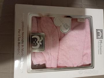 Vendo accappatoio nuovo con etichetta e scatola. Le maniche permettono una maggiore libertà di movimento, mentre il cappuccio protegge la testa della bambina dal freddo, rendendo l'accappatoio funzionale e pratico.