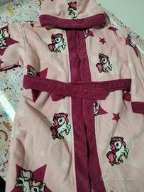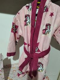 Vendo grazioso accappatoio per bambina con vivace fantasia di unicorni e stelline fucsia su fondo rosa. Ideale per le piccole amanti degli unicorni!Dettagli principali: