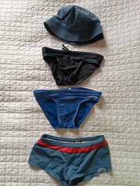 Accappatoio bambino in microfibra marca nabaiji della Decathlon, colore verde fluo, con tre costumi Calzedonia e slip nabaiji. Aggiungo un cappello da pescatore blu taglia 54. Per bambino di 8 anni. Post presente in altri gruppi.