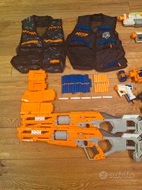 2 giubbotti , 31 proiettili blu 16 proiettili arancioni 5 proiettili bianchi, 2 caricatori 6 colpi 1 caricatore 10 1 caricatore 12 1 caricatore 30, 1 granata nerf, 1 pistola molto potente triao ex 3 elite 2 fucili acustrike series s 1 mitragliatrice infinus elite 1 fucile rapid strike cs-18 1 fucile modulus, accessori: due mirini, due allungatori di canna, 1 silenziatore, 1 calcio porta caricatore 1 torcia uv, 1 manopola. Per i prezzi o informazioni non esitare a contattare