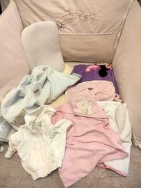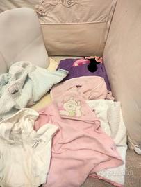 Vendo accessori lettino bimba come da foto: Paracolpi lettino 4 accappatoio neonato Cuscino 2 Coperte 1 Sacco nanna 3 Lenzuoli 2 Federe Copri Ovetto 1 Felpa con cappuccio ( 6 mesi )