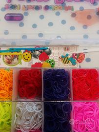 Vendo confezione contenente tutto il necessario per realizzare braccialetti loom bands. La scatola contiene tantissimi elastici, il telaio e gli uncini con cui lavorare, le clips per chiudere le creazione, qualche ciondolo e due libretti di istruzioni che insegnano passo passo come fare. Dagli 8 anni in su