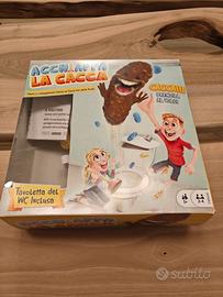 "Il gioco include uno sturalavandini e una simpatica popò: tu ci dovrai mettere i riflessi pronti! Premi la leva dello scarico per tirare il dado e, quando esce il numero, premi lo sturalavandini sul water proprio per quel numero di volte. Ma fa' attenzione, dopo un numero casuale di tentativi con lo sturalavandini, LA POPÒ SPICCA IL VOLO DIRETTAMENTE DALLO SCARICO! Il primo giocatore che acchiappa la cacca guadagna un gettone. Se sei abbastanza rapido da prenderla prima che cada, guadagni DUE gettoni! Vincerà chi avrà ottenuto più gettoni! Il tuo stomaco sarà abbastanza forte per questo gioco? Staremo a vedere! Una montagna di divertimento immediato per 2-4 giovani idraulici, dai 5anni in su. "