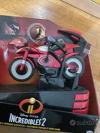 Il kit è comprensivo di: personaggio Elastigirl, moto Elasticycle, rampa di lancio per l'Elasticycle ed un elmetto per il personaggio.