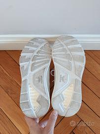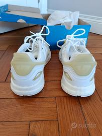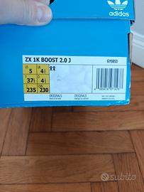 Scarpe Adidas, modello preciso visibile in etichetta sulla scatola. Misura 37 e 1/3. Praticamente nuove, usate pochissimo, solo una piccola macchia di gelato al cioccolato sul bordo interno della scarpa sinistra e una piccola riga grigia all'esterno (visibili nelle foto)