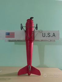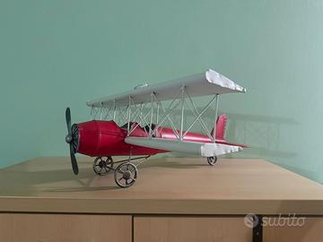 Modellino di aereo biplano, ideale come pezzo decorativo. Presenta una colorazione vivace che lo rende un elemento d'arredo unico.