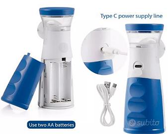 Questo nebulizzatore portatile è adatto per problemi di respirazione e il kit umidificatore a nebbia fredda è adatto per viaggi o uso quotidiano a casa. Protezione contro le perdite: durante il riempimento della tazza della medicina assicurati di non superare il segno massimo (8ml). La quantità di riempimento consigliata è tra 2ml e 8ml. Durante l'uso, inclina il dispositivo fino ad un angolo massimo di 45 ° in qualsiasi direzione. In ogni caso, cerca di tenere il dispositivo in posizione verticale il più possibile. Spegnimento automatico: il dispositivo ha una funzione di spegnimento automatico. Per prevenire danni , il dispositivo si spegne automaticamente quando il medicinale è stato quasi completamente utilizzato. Non utilizzare il dispositivo se la tazza della medicina o il serbatoio dell'acqua sono vuoti. Il dispositivo si spegne automaticamente se la sostanza da spruzzare non è più in contatto con il sensore. Attenzione: non lavare o immergere l'unità in acqua. Non posizionare o trasportare il dispositivo quando c' è una medicina liquida nella tazza della medicina. Portabilità: questo prodotto è di piccole dimensioni e leggero, il che è molto comodo da portare in giro. MAGGIORI INFORMAZIONI Caratteristiche principali: Alimentazione: 2 Batterie AA oppure con cavo usb collegato Peso: 180g Rumorosità: 50db circa Frequenza Nebulizzatore: 120Khz circa Nebulizzatore spray: 0.2 ml/min Ricaricabile utilizzando batterie di tipo ricaricabili AA (non incluse nella confezione) Il design del prodotto verrà inviato in base alla disponibilità di magazzino La confezione contiene: Nr.1 Nebulizzatore aerosol Nr.2 Mascherine (adulto e Bambino) Nr.1 Tubo per bocca Nr.1 Cavo Alimentazione usb Nr.1 Manuale in Inglese