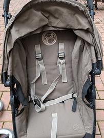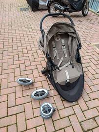Agis M-Air 3 il passeggino a 3 ruote firmato Cybex è maneggevole e pratico grazie alle ampie ruote in gomma antiforatura, che consentono di percorrere qualsiasi tipo di terreno e al sistema di chiusura ultra compatto anche con una sola mano. Il telaio in alluminio è leggero e robusto, può trasformarsi facilmente in un sistema travel system grazie agli agganci per l’installazione della navicella e del seggiolino auto Cybex (venduti separatamente). Il maniglione unito e le doppie ruote anteriori piroettanti o bloccabili consentono una guida comoda e fluida. Anche il bambino durante le passeggiate godrà del massimo comfort grazie alla seduta ampia e imbottita, allo schienale reclinabile fino a 180° e alla cintura di sicurezza integrata a 5 punti con spallacci imbottiti. In dotazione viene data anche la barra di protezione facilmente amovibile e l’ampia capottina estendibile per proteggere il bambino dal sole e dal vento. Dimensioni: Aperto: Alt. 100-106 x Larg. 57 x Prof. 97 cm Chiuso: Alt. 35 x Larg. 57 x Prof. 75 cm Peso: 8,8 kg