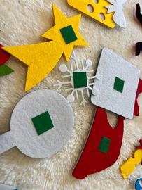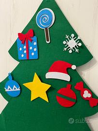 Albero di Natale in feltro da appendere. Alto 1 metro e largo 68 cm nel punto più largo. Include 29 decorazioni.
