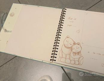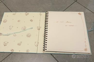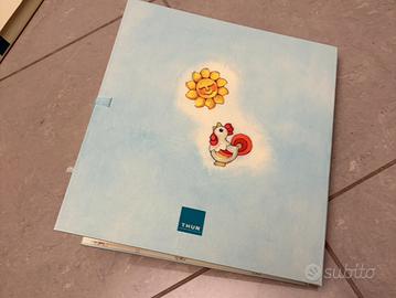 Album fotografico Thun con disegno a tema fattoria e cuccioli di cane con scatola. - Illustrazione con due cani, una fattoria, un gallo e un sole sorridente. - Chiusura con nastrino azzurro.