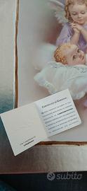 Album portafoto Battesimo raffigurante neonato con angeli custodi. Agli angoli 2 lamine in argento.