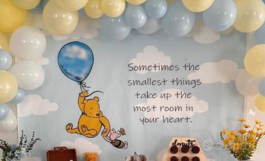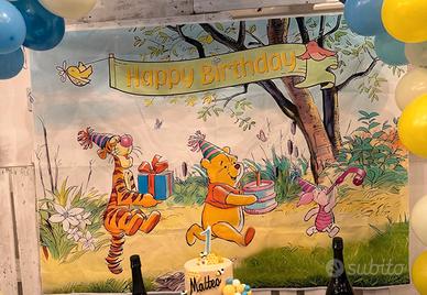 Addobbi per primo compleanno bimbo tema Winnie the Pooh, alcune cose usate altre nuove. (Palloncini, cubi, peluches, due teli sfondo, spargi miele, cornici a forma di 1 ecc)