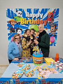 come da titolo, allestimento completo di tovaglia torta finta, bicchieri, piatti, poster (2,10x1,50metri) pignata di cartone e cartoncino alta circa 1 metro, all'interno ci entrano più di 5kg di caramelle.