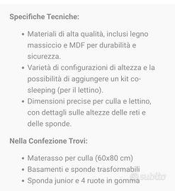 ottime condizioni, struttura con accessori di materasso e paracolpi culla parziale, materasso lettino piccolo e grande.