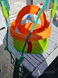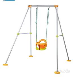 Adatto ai bambini a partire dai 18 mesi. Altalena con struttura in metallo, altezza 180 cm, dotata di seggiolino in plastica evolutivo 2 in 1, portata 25 kg. La struttura è realizzata in solido metallo e necessita di ancoraggio a terra con cementificazione per garantirne la stabilità. L’assenza di saldature elimina il rischio di rottura e la rende più resistente.