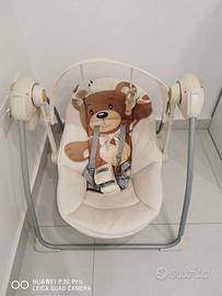 Altalena della cam con riduttore funzionante sia con batterie sia in presa ha 3 velocità e 5 melodie modificabili insieme al volume con morbido schienale regolabile in 2 posizioni dotato di timer per spegnersi automaticamente compreso di scatolo