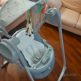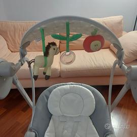 Vendo altalena polly swing della Chicco. Altalena elettronica per cullare il bambino dalla nascita fino ai primi anni, dentro e fuori casa. Il pratico telecomando permette di attivare tutte le funzionalità anche a distanza. Movimento a dondolo con 4 velocità e dispositivo di vibrazione installato sulla seduta per garantire il massimo relax. Musiche divertenti,melodie e suoni della natura intrattenere il bambino. Schienale reclinabile in 3 diverse posizioni per adattarsi sia ai momenti di gioco che di relax. Barra gioco dotata di 3 morbidi peluches. Struttura richiudibile e compatta.