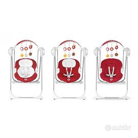Di serie: telecomando che attiva il movimentoi a dondolo e aziona le musiche e i suoni, vassoietto staccabile con spartigambe rigido e dispositivo di vibrazione che culla dolcemente il bambino.