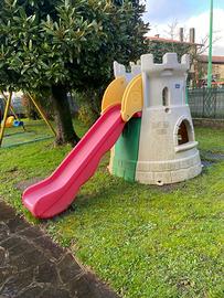 altalena doppia sia per bambini piccoli, che bambini un po’ più grandi, e scivolo con scaletta e casetta. é in buone condizioni, anche se é da pulire