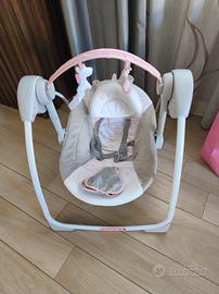 Altalena compatta flora di ingenuity. questa altalena è compatta ma ricca di funzionalita'. 12 melodie rilassanti, 2 posizioni di reclinazione e dondolio automatico con timer di spegnimento automatico regolabile (30, 45 e minuti). il design compatto e ripiegabile dell’altalena la rende pratica per il viaggio o per lo spostamento da una stanza all’altra in casa. il poggiapiedi imbottito e i supporti laterali offrono un comfort ottimale per il vostro bambino. sapendo che il vostro piccolo è al sicuro grazie a una cintura di aggancio a 5 punti potrete riposarvi con più tranquillità. i dettagli rosa e i giocattoli a farfalla e unicorno la rendono ideale per una bimba. raccomandata per bambini da 0 a 9mesi.
