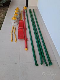 Altalena due posti di grande dimensione rispetto a prodotti similari. Vedasi le misure. Attualmente già smontata e riverniciata. Mancano le funi dei 2 seggiolini. Per fissaggio sicuro a terra vengono forniti anche 4 basi in cemento. Trasporto a cura acquirente con un automezzo che consenta il carico dei pali lunghi 270 cm.