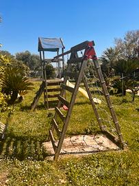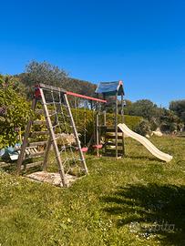 Vendo gioco da giardino con arrampicata, scivolo e altalene per bambini fini a 10/12 anni. Il legno non e rovinato ma andrebbe ritrrattato con impregnante, la plastica e sana solo un po scolorita per via del sole. Prezzo trattabile (valuto il miglior offerente) Troverete il gioco smontato e pronto per essere rimontato completo in tutte le sue parti