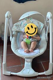 Altalena a sdraietta , struttura pieghevol e compatta. Adatta a neonati da 0 a 9 mesi. Imbracatura a 5 punti. Cuscinetto riduttore per la testa. 5 velocità di oscillazione. 12 melodie rilassanti e 4 suoni della natura. Incluso arcogiochi con un peluche. Rivestimento sfoderabile e lavabile in lavatrice. Misure da aperta: L 77,47 x P 53,34 x H 60,96 cm