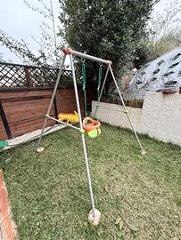 Dotato di seggiolino evolutivo 2 in 1, altezza 180 cm. La struttura in tubolare metallico la rende solida e resistente, munita di piedini antiscivolo colorati. è necessario ancorare l' altalena a terra con cementificazione per garantirne la sicurezza. Dimensioni: 164L x 168P x 180H cm Peso: 12,3kg. adatto a bambini a partire dai 18 mesi di età.