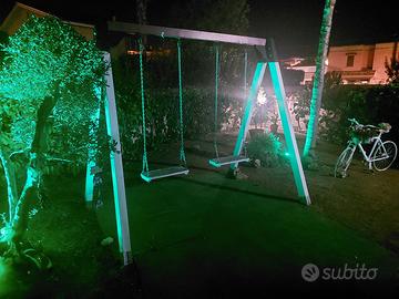 altalena 2 posti con asse portante in metallo verniciato.Supporti di sostegno in legno lamellare