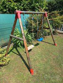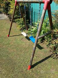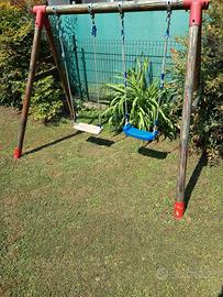 Altalena in legno da 2 posti, tenuta molto bene,adatta per bambini con altezza max 150 cm. Le dimensioni sono, altezza 160, profondità 140, larghezza 210. Per una maggiore sicurezza i pali sono stati inseriti in una apposito sostegno piantato per terra,in modo che l'altalena sia più ferma a rigida. Sempre mantenuta coperta d'inverno e trattata con i prodotti appositi da legno durante il periodo estivo. Per qualsiasi informazione resto a disposizione.