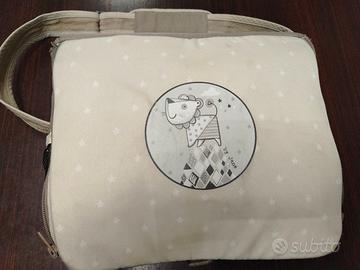 Comodo ed elegante alzasedia per bimbo. Si fissa a tutti i tipi di sedute grazie alle apposite cinghie di aggancio dello schienale. 3 comodi scomparti accessibili tramite zip permettono di sfruttarla come borsa. Tessuto sfoderabile e lavabile. Pratico e comodo grazie alla semplice trasformazione in comoda borsa con tracolla.