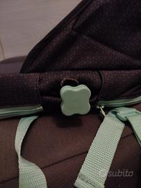 Con cinghie per assicurarlo alla sedia e manopola laterale per regolare l'altezza della seduta.