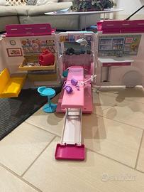 Con quest'ambulanza di Barbie, completa di tutti gli accessori come da foto, è possibile inventare casi medici di ogni tipo: fratture, radiografie, medicazioni, problemi di vista...