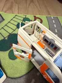 Ambulanza PLAYMOBIL dotata di luci e suoni per un gioco di emergenza realistico. Include 2 personaggi PLAYMOBIL, un'ambulanza completamente attrezzata, barella, defibrillatore, flebo e strumenti medici.