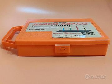 -valigetta di colore arancione con manico e chiusura a gancio;