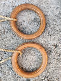 Anelli in legno con corde Per esercizi da ginnastica Vintage Dalla famosa casa giocattoli vintage Arcofalc Made in Italy Le corde da piegate misurano 150cm E gli anelli sono larghi 22cm