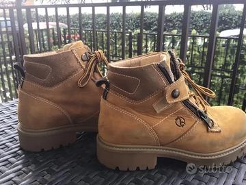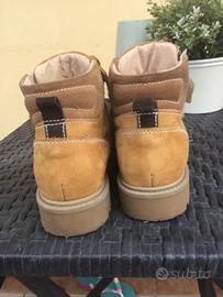Scarpe invernali da bambino Nero Giardini Junior, anfibi modello timberland in camoscio tg 31. Hanno lacci gialli che passano attraverso occhielli metallici in stile D-ring e ganci superiori, oltre a una cerniera laterale per una facile calzata . Le cuciture sono evidenti e di colore a contrasto. Sulla parte esterna della caviglia è presente un piccolo logo impresso. Leggero segno di usura sulla parte antero-laterale che segnalo per correttezza.