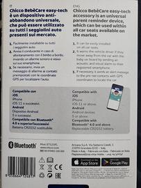 Vendo dispositivo anti abbandono universale Chicco. Compatibile con Ios e Android. Mai utilizzato ancora nella scatola originale imballata. Massima serietà e disponibilità
