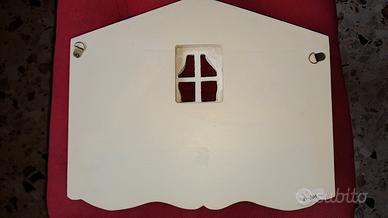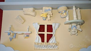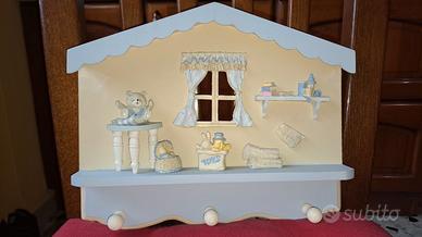 Appendiabiti bianco azzurro in legno per la cameretta del bimbo, decorato con piccoli soggetti e con 3 inserti per appendere i vestiti del neonato; è possibile appenderlo perchè dispone di ganci sul retro.