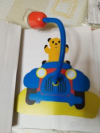Applique da parete per camerette bambini con interruttore a fune. Porta lampada con braccio flessibile. Mai usato, ancora scatolato. Completo di istruzioni, kit per il montaggio e lampadina. Materiale: legno, metallo, plastica. Dimensioni: 22x22 circa.
